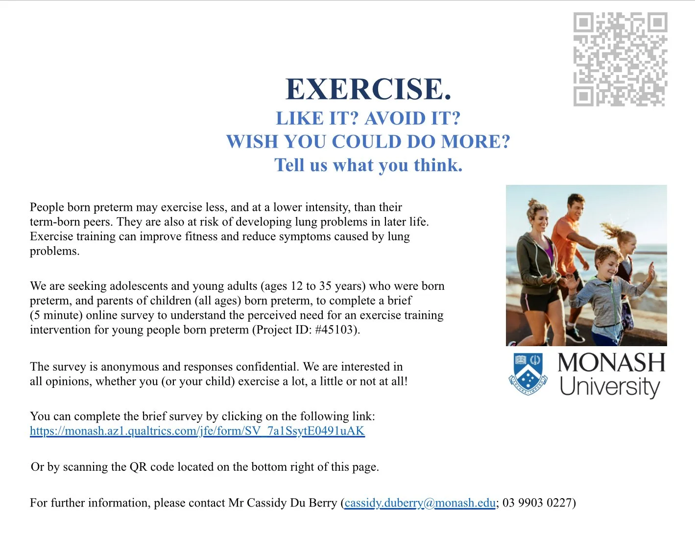 We are seeking adolescents and young adults (ages 12 to 35 years) who were born preterm, and parents of children (all ages) born preterm, to complete a brief (5 minute) online survey to understand the perceived need for an exercise training intervention for young people born preterm (Project ID: #45103).